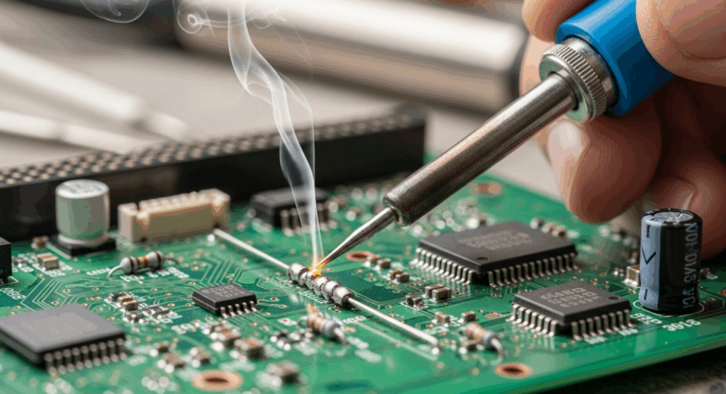 Some designs include components that cannot be surface-mounted, so through-hole assembly steps follow reflow where required. These parts pass their leads through drilled holes, providing strong mechanical support for connectors, large capacitors and heavier components. Soldering may be completed by hand or by wave soldering, depending on volume and design.
